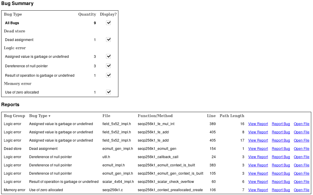 报告中的代码部分全部在第三方libsecp256k1库中,该库是加密代码,并可能采取了特殊措施,使静态分析器出现拒绝情况,但这样做有充分的理由(例如,防止定时攻击或确保绝对机密) 数据不会泄漏)。